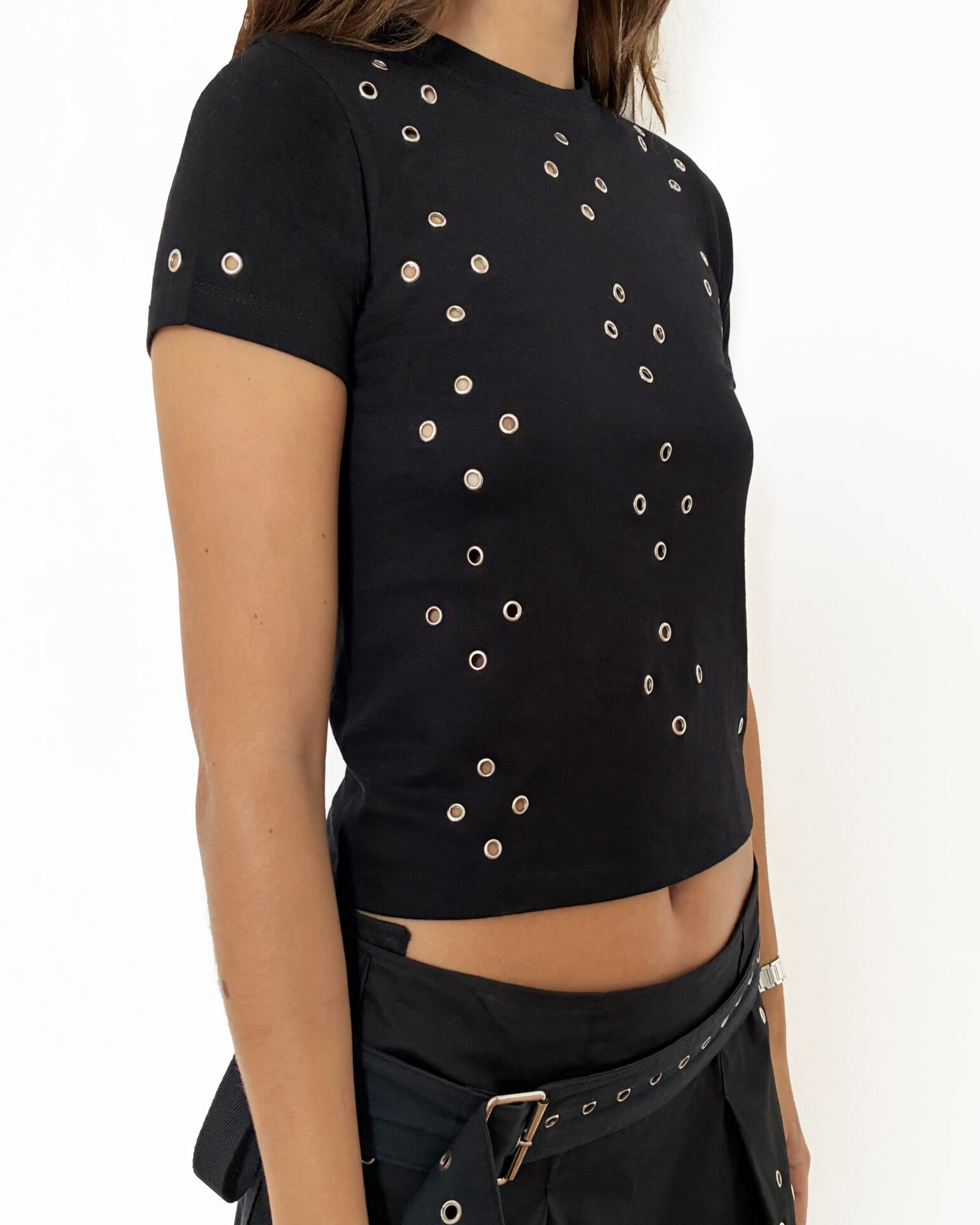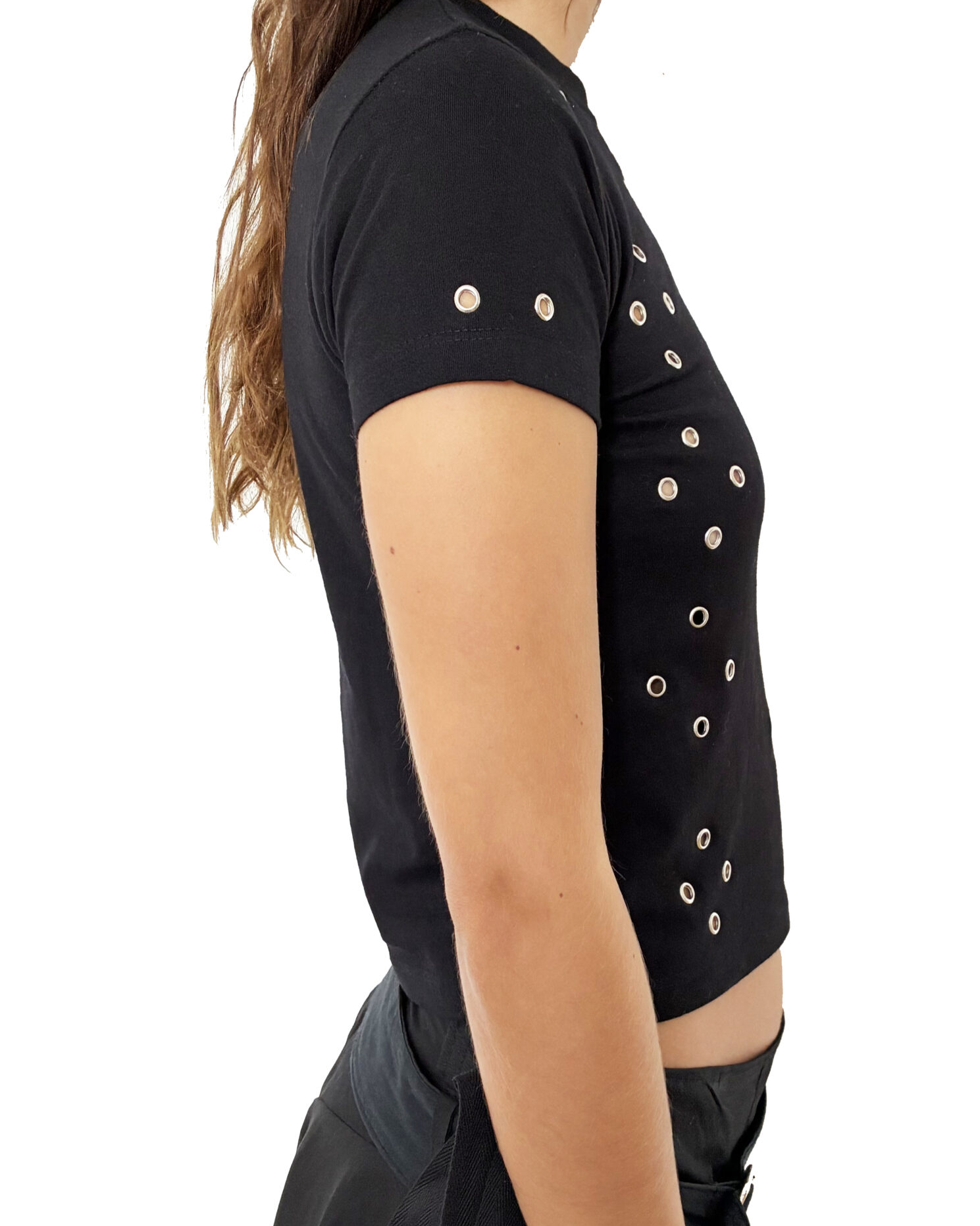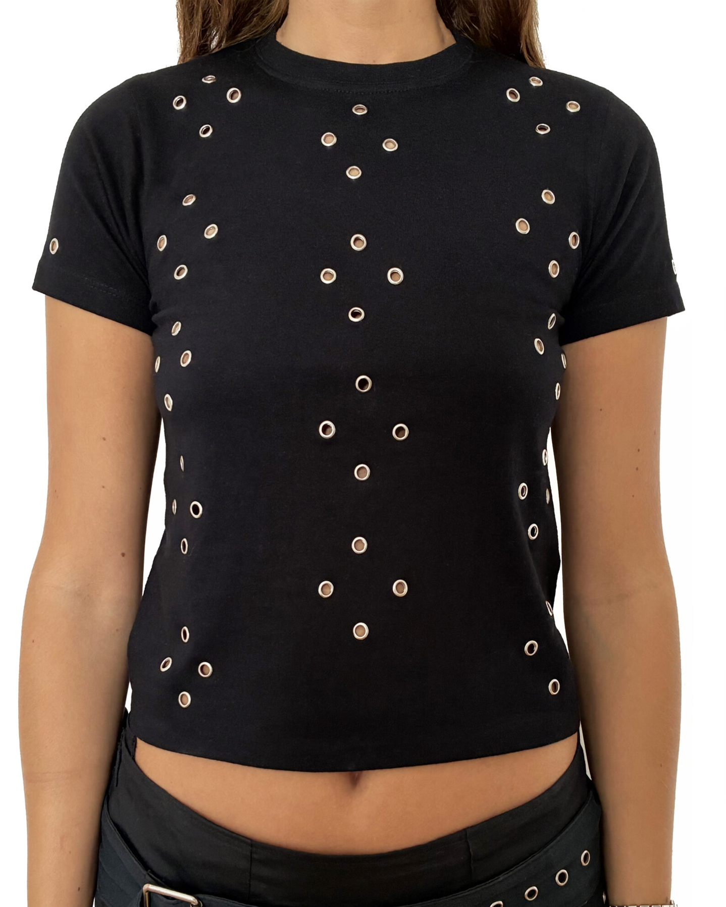 Black eyelet t-shirt crafted from 100% organic cotton. Designed with all-over metallic eyelet detailing for a modern, edgy look. Soft, breathable, and sustainably made. This style has a small fit