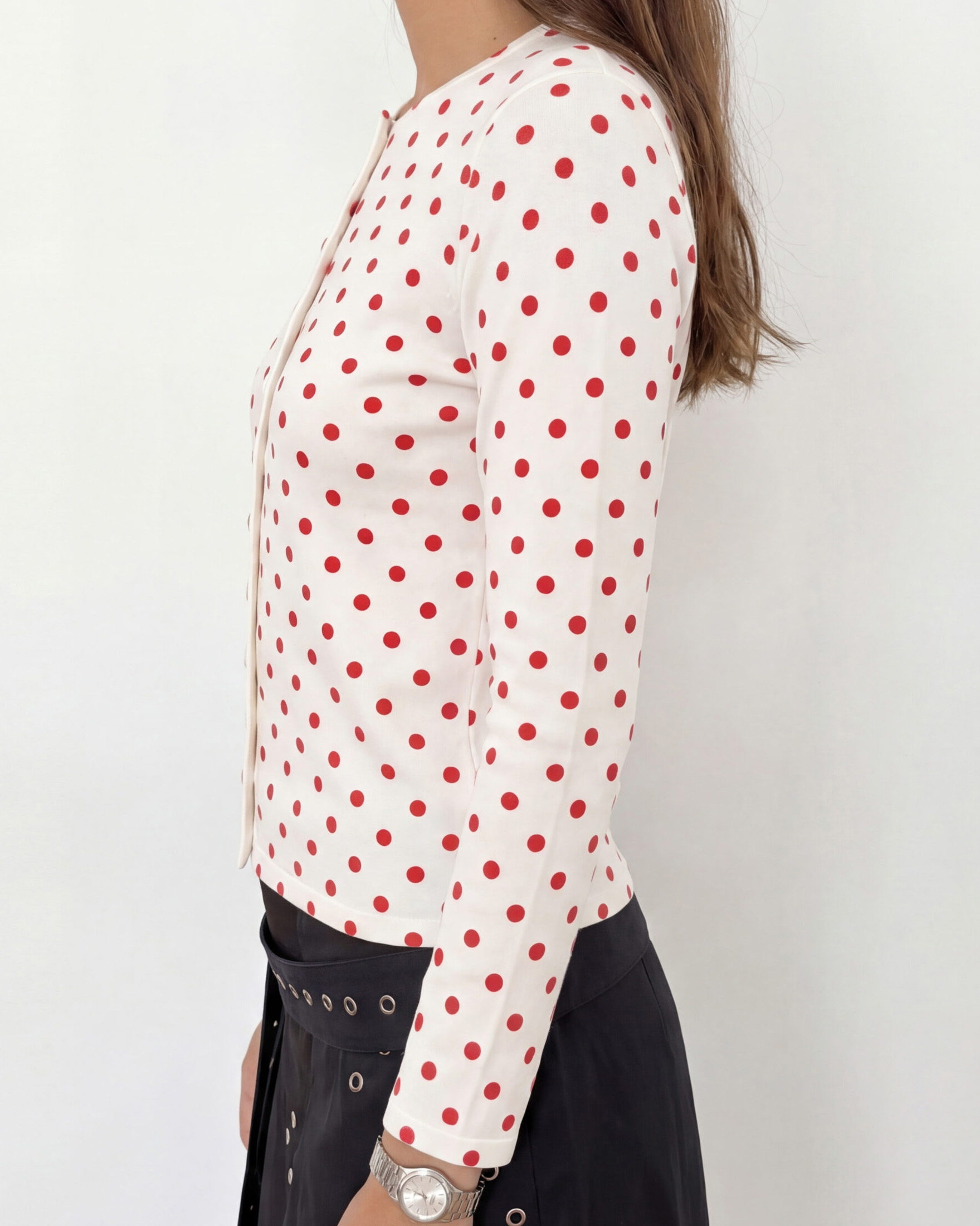 Our cardigan is crafted from soft stretch jersey designed with a classic round neckline and covered front buttons.